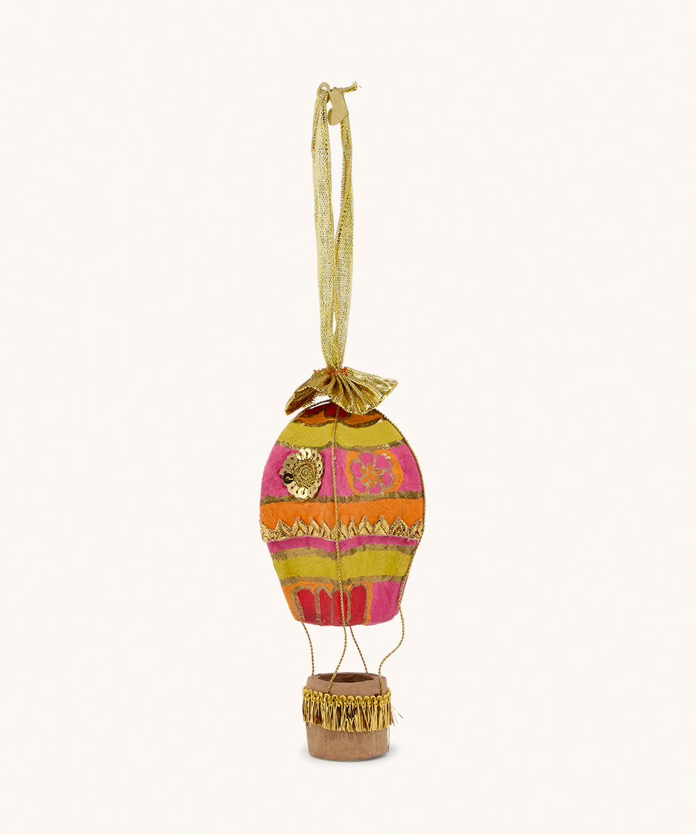 Entdecken Sie den Hari Luftballon-Ornament, eine farbenfrohe Ergänzung für Ihre festliche Dekoration. Handgefertigt von talentierten Handwerkern in Indien, besteht dieses Ornament aus recycelter Baumwolle in lebhaften Rosa-, Orange- und Grüntönen. Mit einer Größe von 16 x 10 x 10 cm...