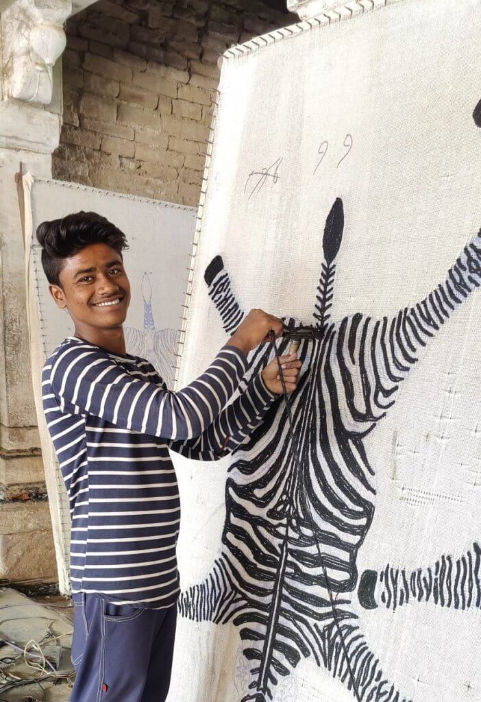 Lorsque le tufting est terminé, l’artisan commence par fixer le support en coton. Ensuite, tous les côtés sont finis à la main avec des fils de laine.