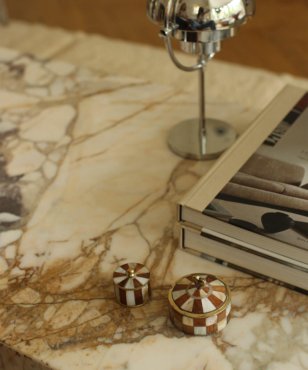 Présentation de la Boîte de Cirque Bailey Woody - un charmant mélange d'attrait rustique et de praticité. Fabriqué à la main en Inde à partir de laiton, de résine et de coquillage. Ce pièce de rangement unique est un témoignage du savoir-faire artisanal et du soutien communautaire.