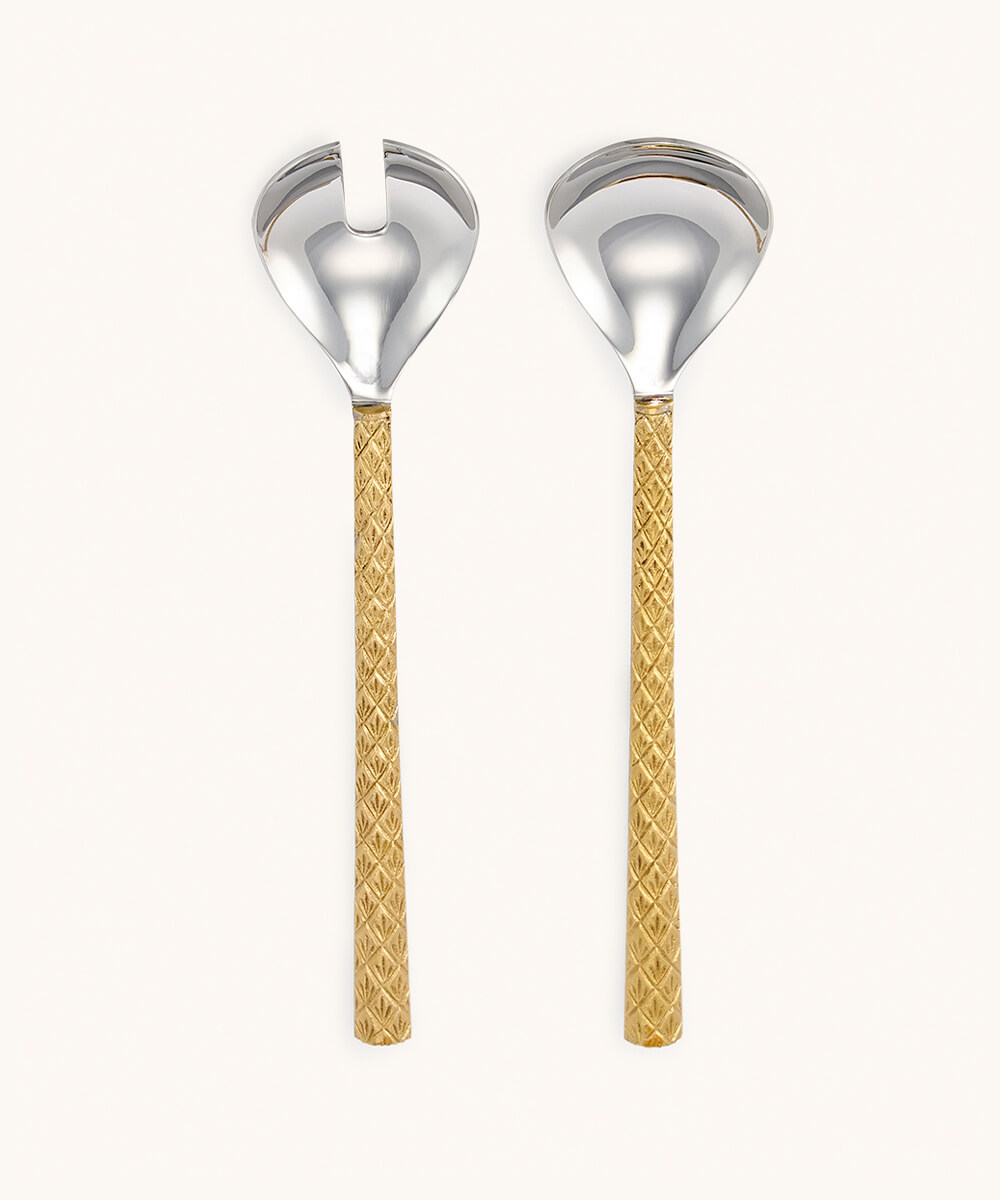 Vivez l'alliance parfaite de la fonctionnalité et du design avec les Couverts à Salade Palmier Marlin. Cette paire élégante, dotée d'un crochet pratique pour reposer sur votre saladier, apporte commodité et style à chaque repas. La fusion d'acier inoxydable durable et de laiton riche, façonnée à la main par nos artisans en Inde, ajoute une touche de luxe durable à votre collection de vaisselle.