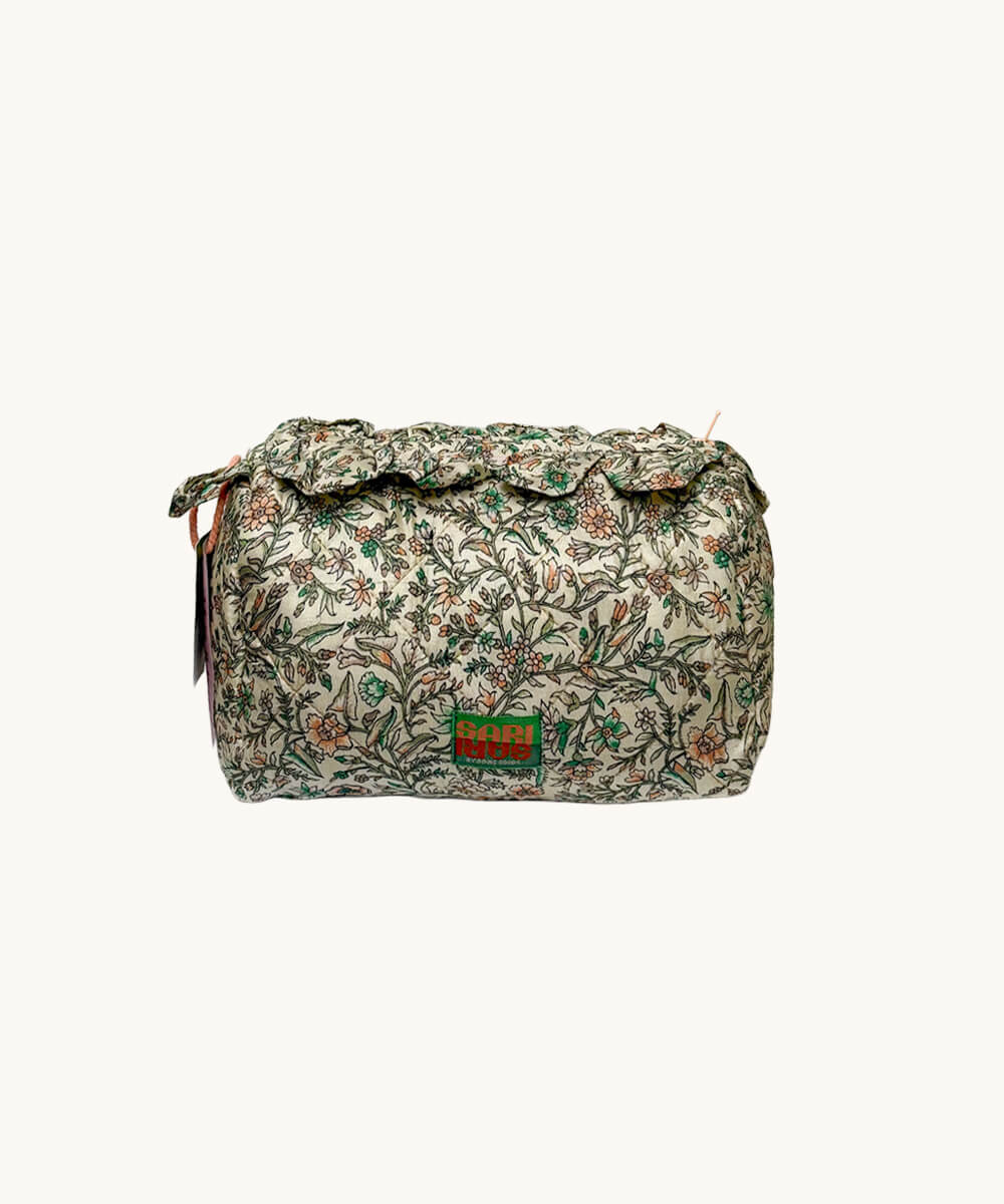 La Trousse de Beauté Small Jojo Jojo est fabriquée à partir d’un sari vintage et présente une structure matelassée et douce, décorée de jolis volants sur le dessus. Le motif unique du sari rend chaque trousse vraiment unique.