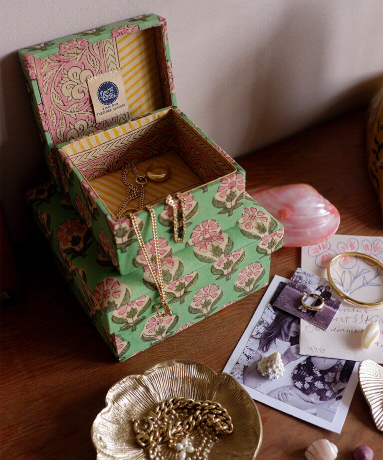 Gardez toutes vos affaires dans notre set de boîtes en tissu Botanical Hexagoon. Ces boîtes sont fabriquées en bois et recouvertes d'un tissu 100% coton imprimé à la planche, à l'extérieur comme à l'intérieur. L'impression à la planche est notre technique d'impression textile préférée, elle est lente et fastidieuse mais nous l'adorons ! Utilisez les boîtes en tissu pour vos bijoux ou vos autres objets précieux. En raison de la nature artisanale de cet article, attendez-vous à de légères variations dans son apparence.