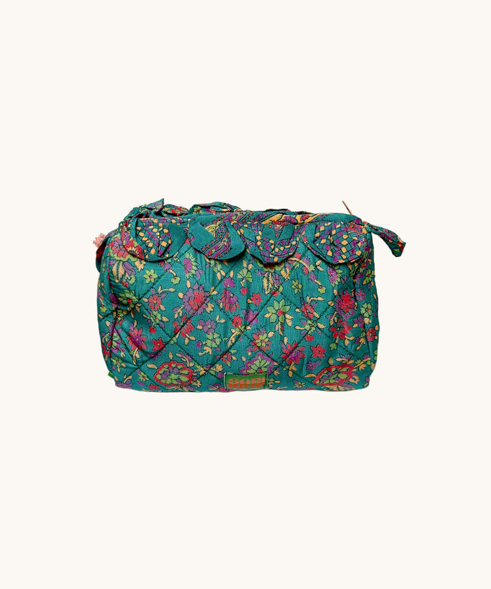 The Jojo Jojo Beauty Bag Small is handcrafted from a vintage sari and features a soft, quilted structure with charming ruffles along the top edge. The sari’s unique pattern makes every bag completely one-of-a-kind.