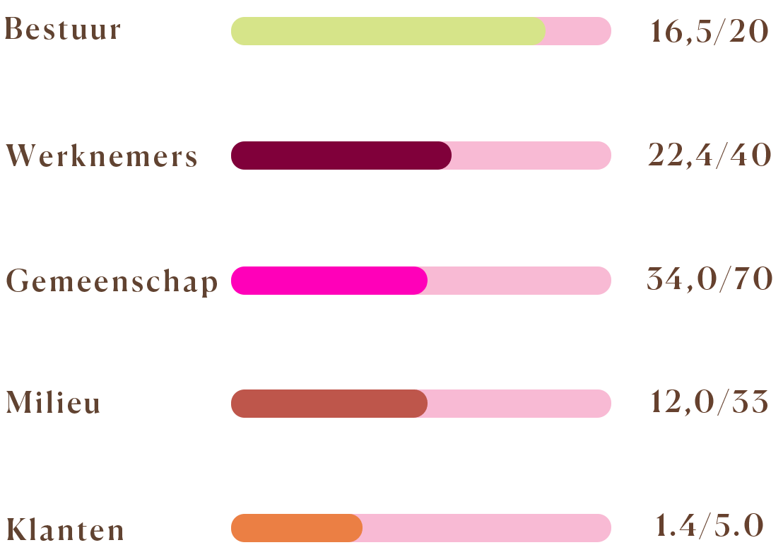 Als onderdeel van het certificeringsproces zijn we door B Lab beoordeeld op vijf thema’s: bestuur, medewerkers, gemeenschap, milieu en klanten.