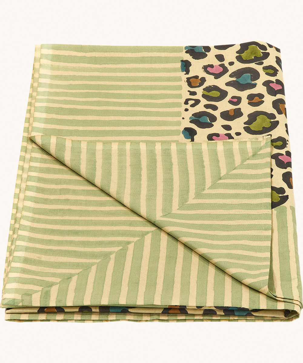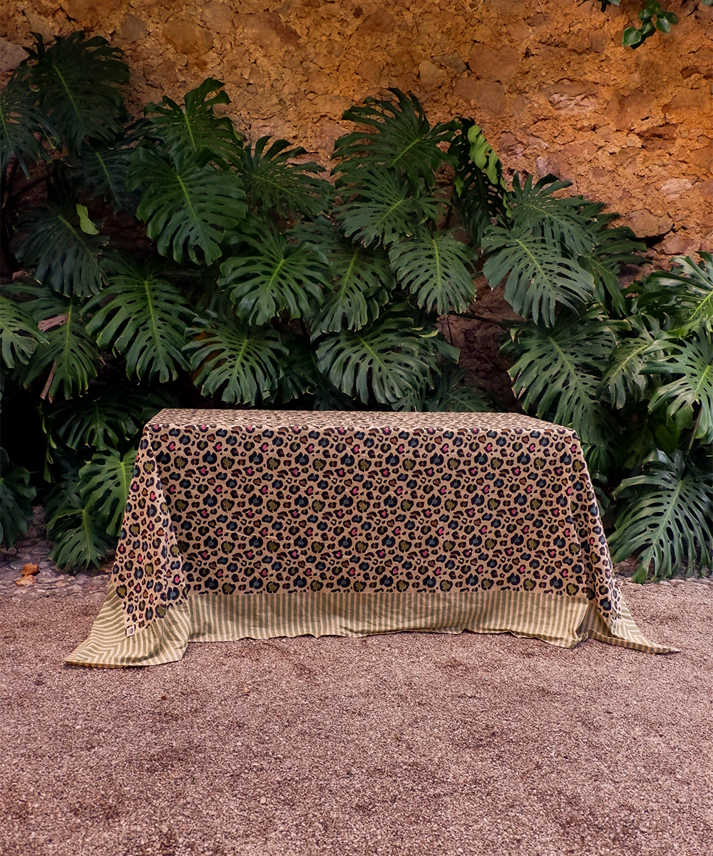 Geef je huis of buitenruimte een stijlvolle, speelse uitstraling met het Disco Leopard Tafelkleed. Met zijn opvallende luipaardprint en frisse groene accenten is het een perfecte combinatie van speels en chic. Handgemaakt in India met traditionele blockprint-technieken, is dit veelzijdige katoenen tafelkleed ook ideaal als picknickkleed of strandlaken. Geleverd in een bijpassende draagtas, is het perfect voor tuinfeestjes, stranddagen of ontspannen buitenmomenten.