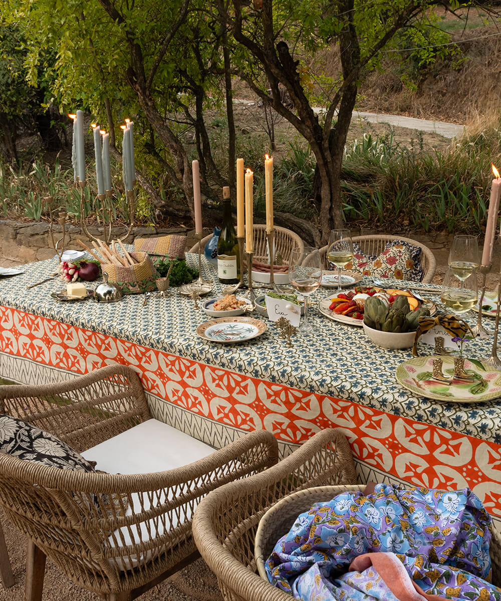 Ontdek het Faina Tafelkleed, een groot en prachtig handbedrukt tafelkleed, ideaal voor grotere tafels met een afmeting van 160 x 350 x 0.20 cm. Dit veelzijdige tafelkleed, gemaakt met traditionele houtblokdruktechnieken, is niet alleen functioneel maar ook een decoratieve toevoeging aan je eetruimte, zowel binnen als buiten. Het voegt een verfijnde, koelgetinte elegantie toe, perfect voor stijlvolle maaltijden en outdoor evenementen. Als extra gemak komt het met een bijpassende draagtas.