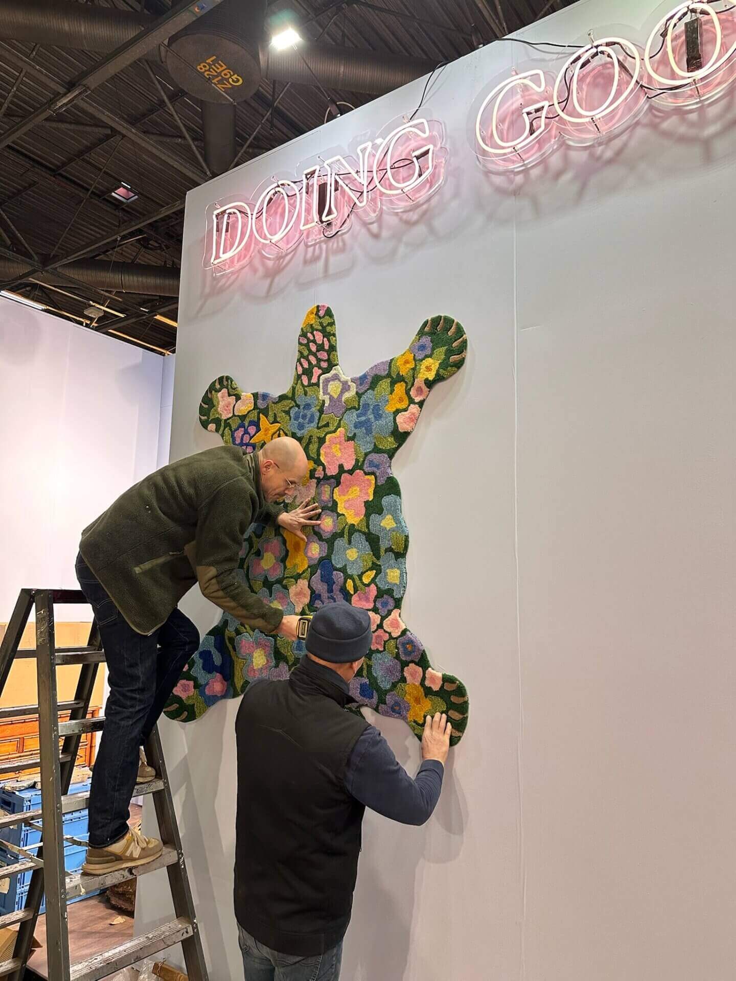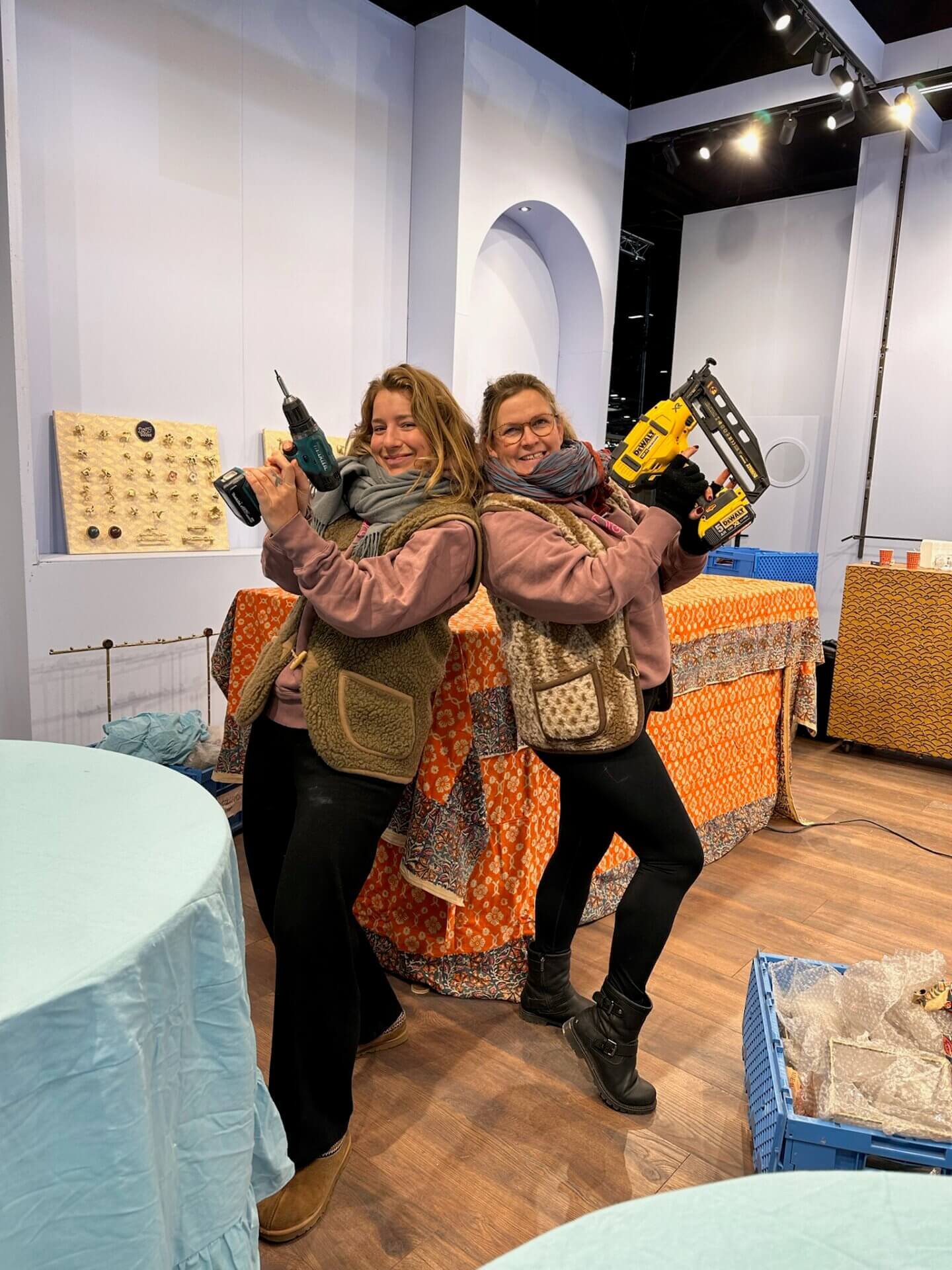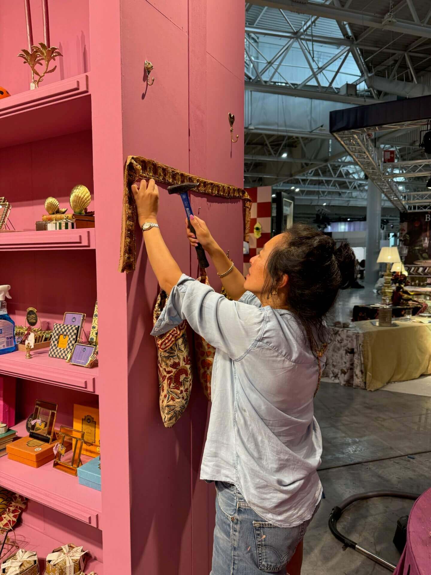 These days, things are more comfortable. We work with a great booth builder. When we arrive, the walls are already up, and our job is to style the booth in the best way possible.