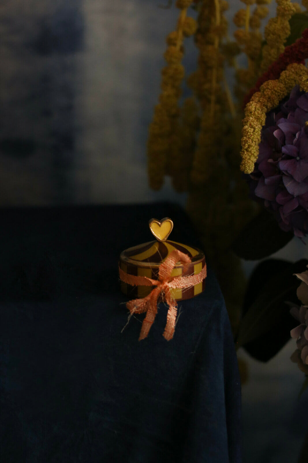 Add a playful yet elegant touch to your home with the Pyar Heart Circus Box Medium Yellow. This medium-sized decorative storage box is handcrafted from 60% recycled brass and 40% resin, making it both beautiful and sustainable. The round shape, bold stripes in yellow and burgundy, and the adorable heart-shaped handle on top give it a unique and joyful appearance.