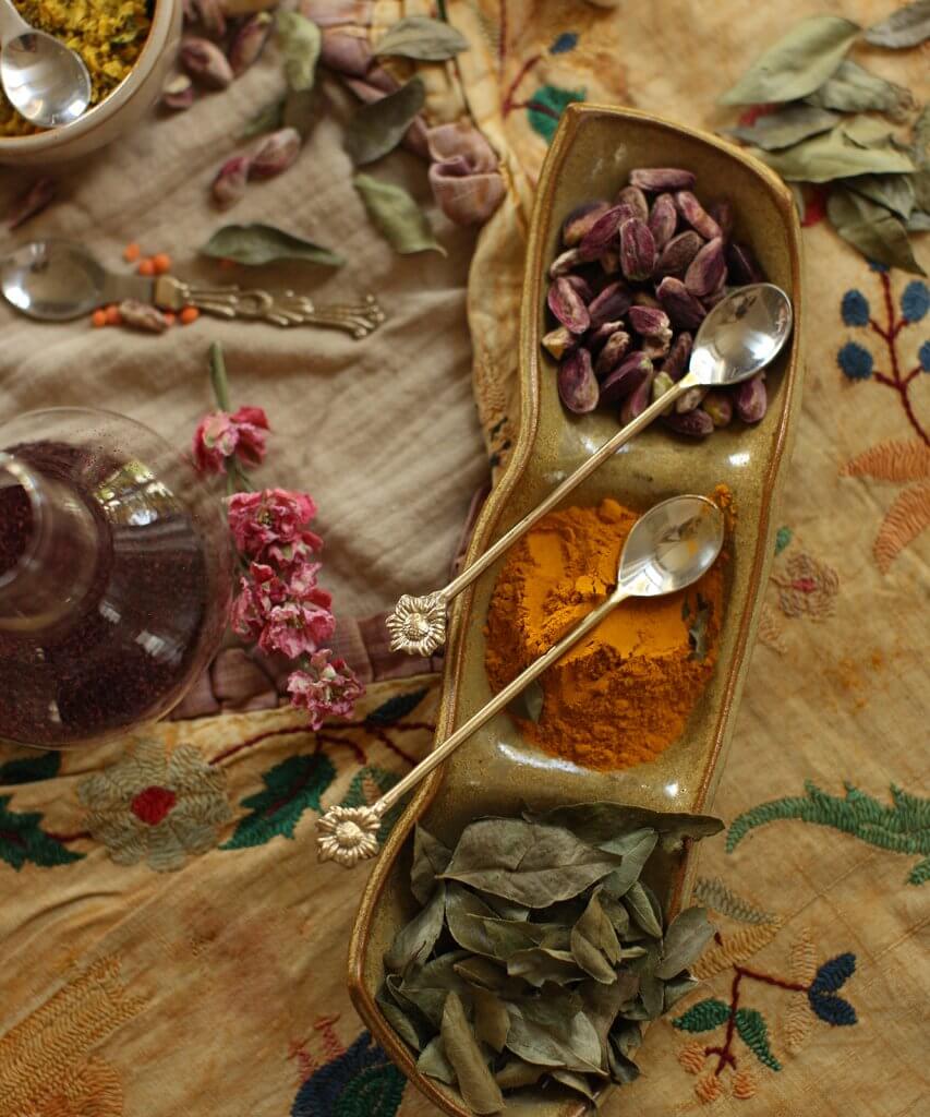 These teaspoons are handmade in India from 100% recycled brass. The spoon part is made of stainless steel. Due to the handcrafted nature of this item, expect slight variation in the appearance of each item. Perfect by no means, but unique all the more!