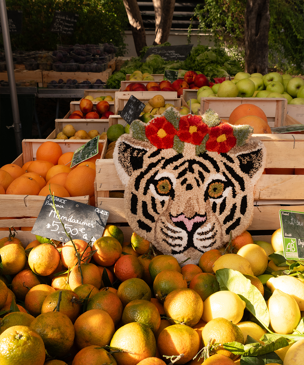 Channeling the creative muse of Frida Kahlo, this rug features the majestic profile of a white tiger crowned with a burst of lively flowers. Expertly crafted, this distinctive piece creates a bold focal point, drawing eyes and admiration.