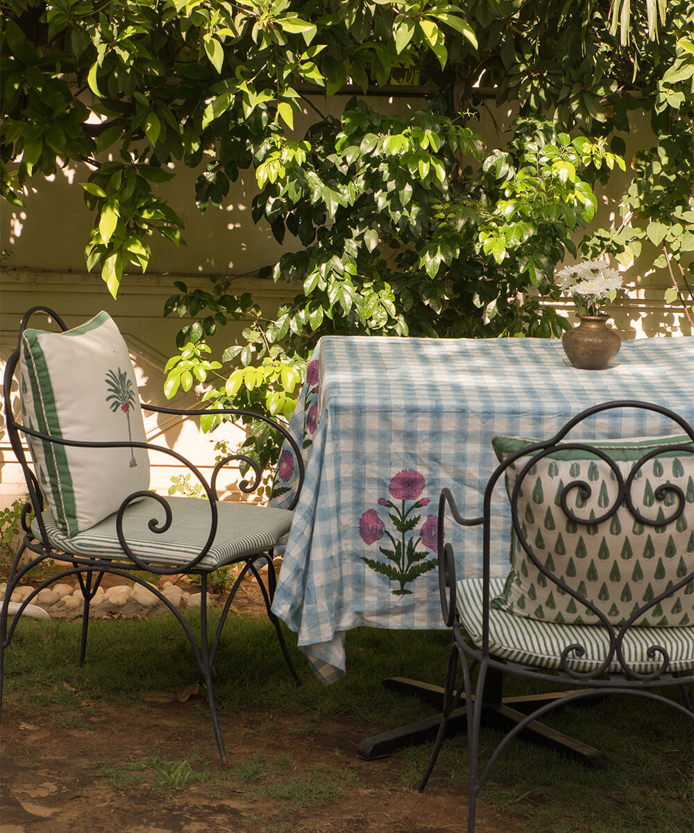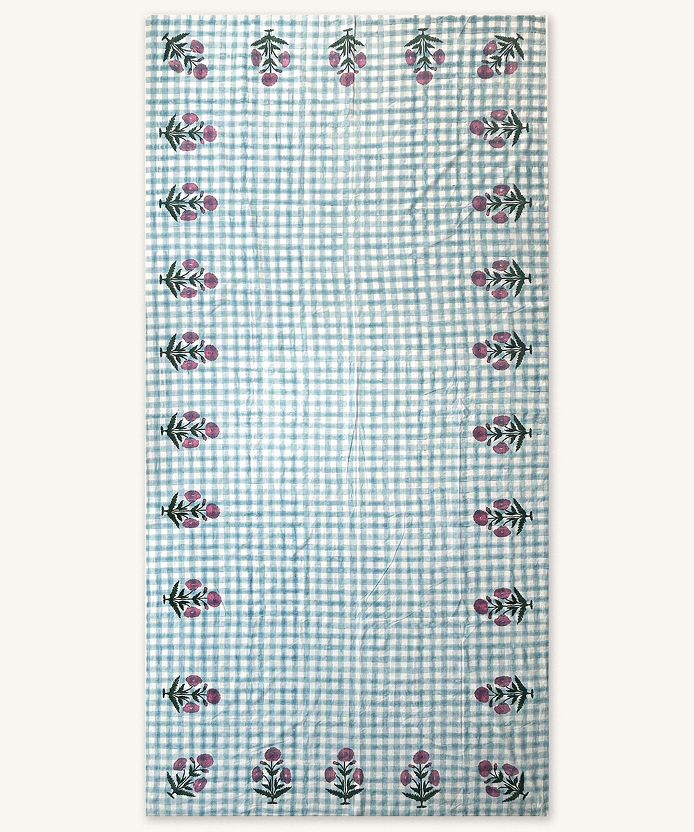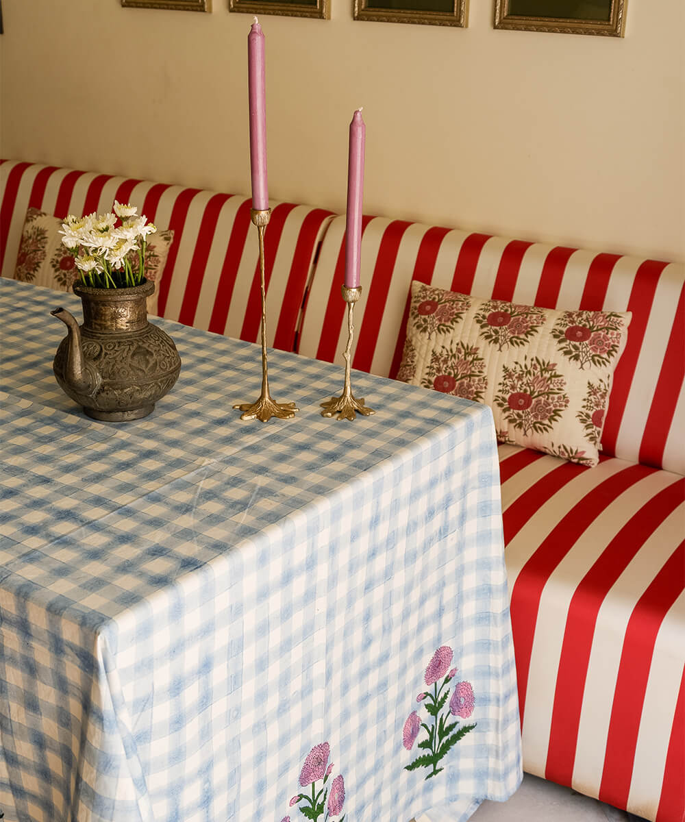 The Iris Tablecloth features a classic blue and white checkered pattern that brings a sense of calm and elegance. A playful red floral border adds a cheerful touch, making this tablecloth a true eye-catcher for your table setting.