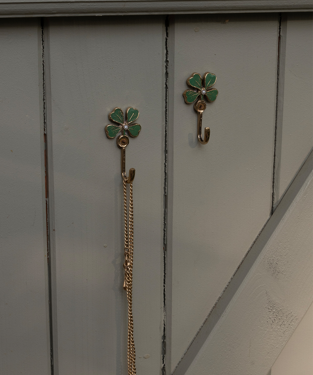 The Lucky Clover Hook Mini features a whimsical four-leaf clover design, each leaf intricately detailed and hand-painted in vibrant green, symbolizing hope, faith, love, and luck. This delightful piece is perfect for hanging keys, jewelry, or even small trinkets, making it a versatile and practical adornment for any room.