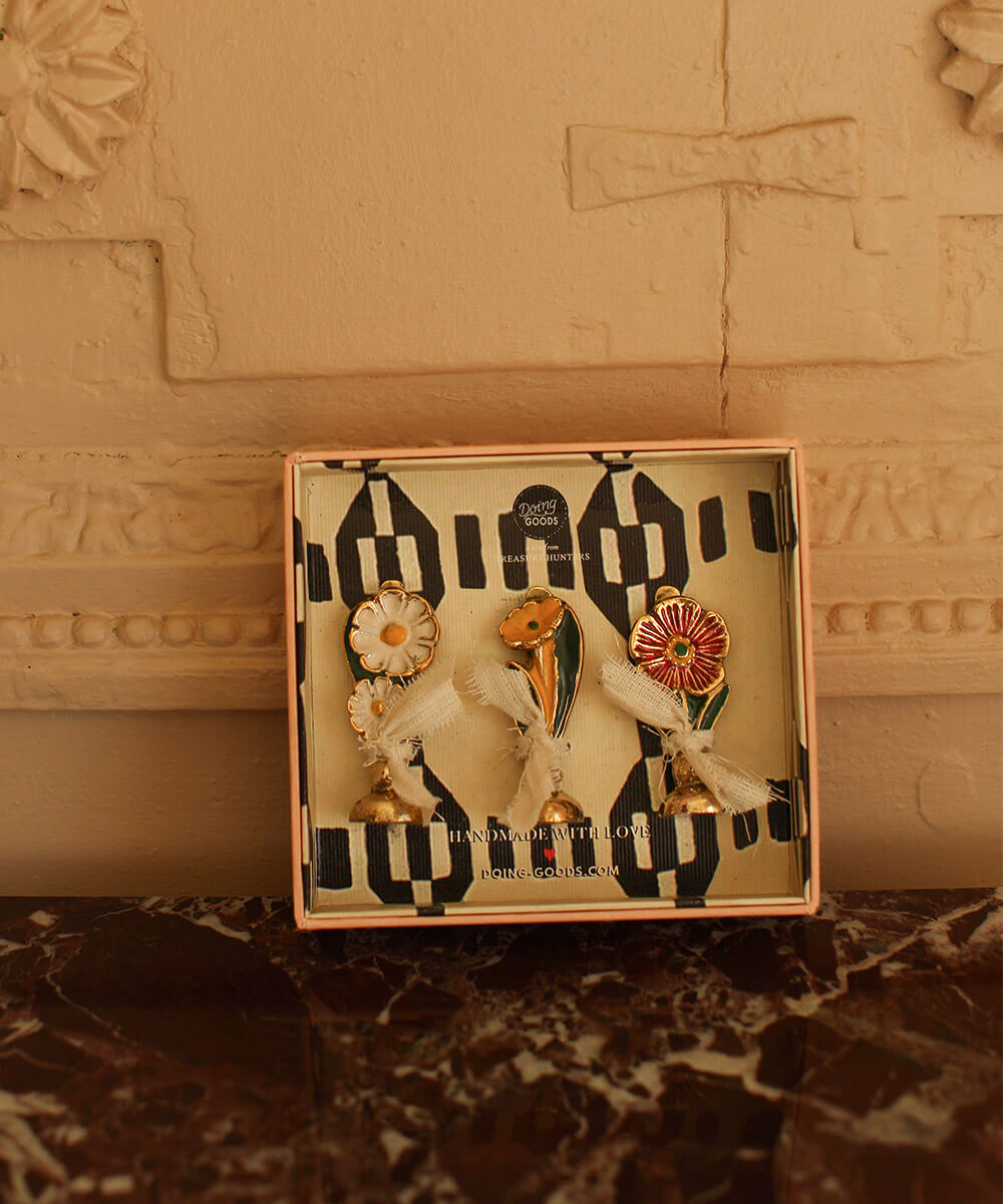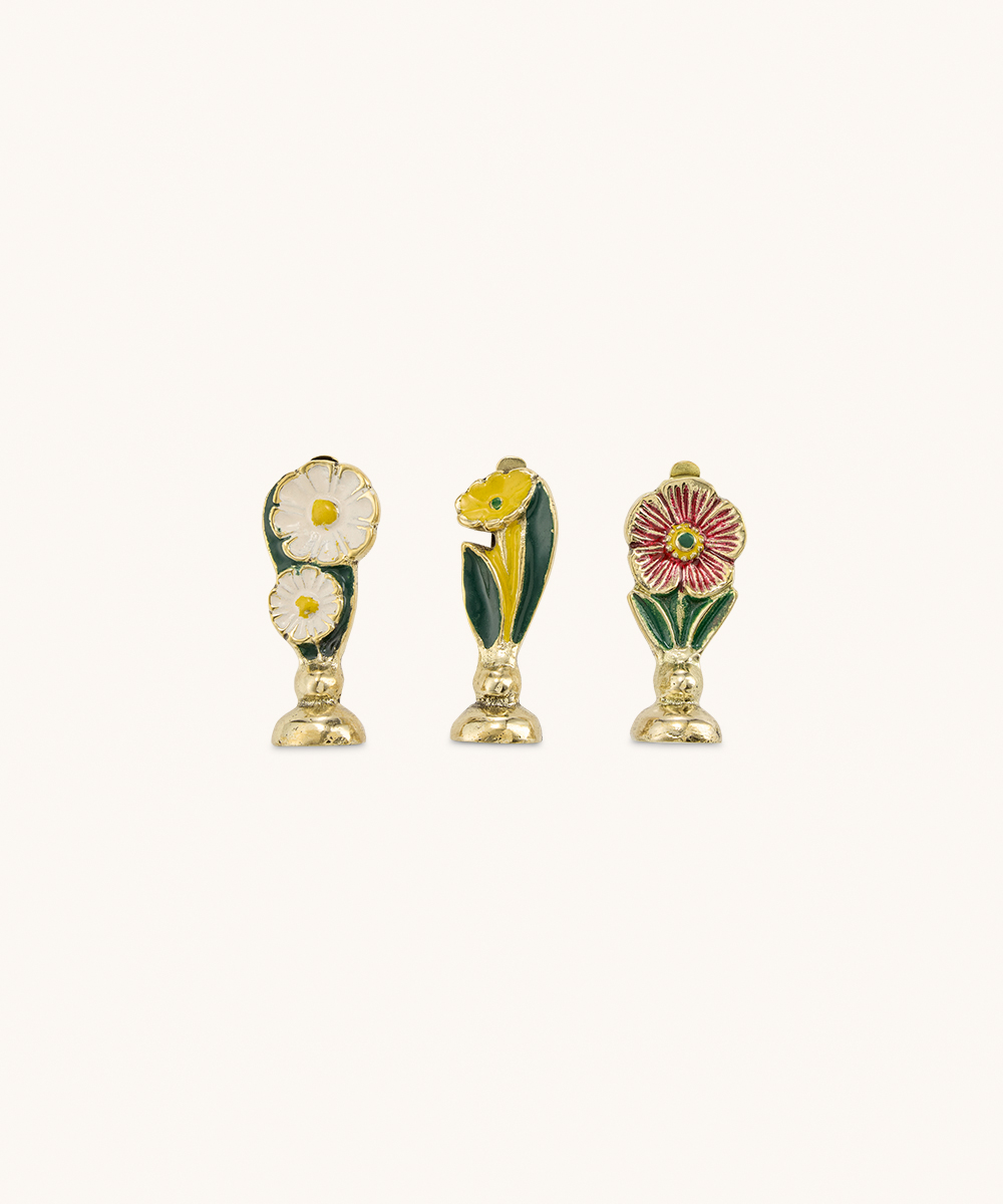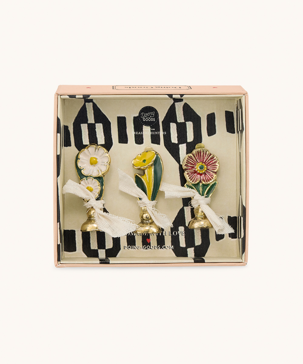 Bring charm and elegance to your table setting with the Posy Card Holder Set. This set of 3 handcrafted card holders, each shaped like a cheerful flower, is made from recycled brass and comes neatly packaged in a beautiful gift box.