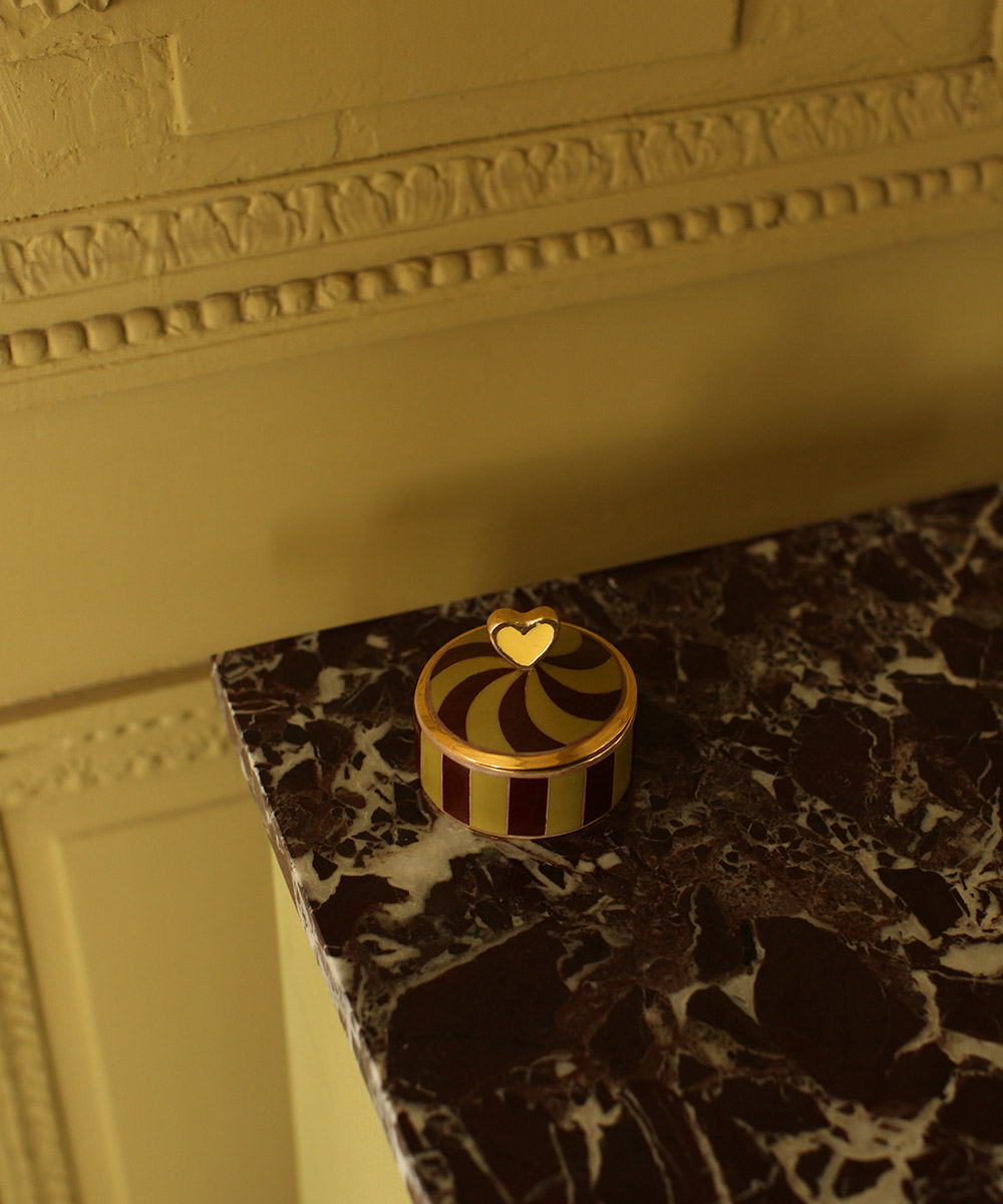 Add a playful yet elegant touch to your home with the Pyar Heart Circus Box Medium Yellow. This medium-sized decorative storage box is handcrafted from 60% recycled brass and 40% resin, combining beauty and sustainability. The round shape, bold stripes in yellow and burgundy, and the heart-shaped lid handle give it a unique and joyful appearance.