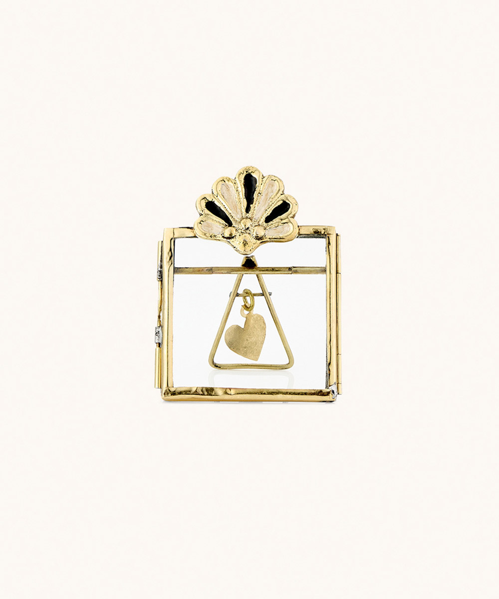 This glass photo frame stands out thanks to its delicate details. The transparent panels provide a crisp view of your image or card, while the brass structure gives it a warm, classic look. The shell-shaped detail on top adds a decorative flourish, making it more than just a functional frame.