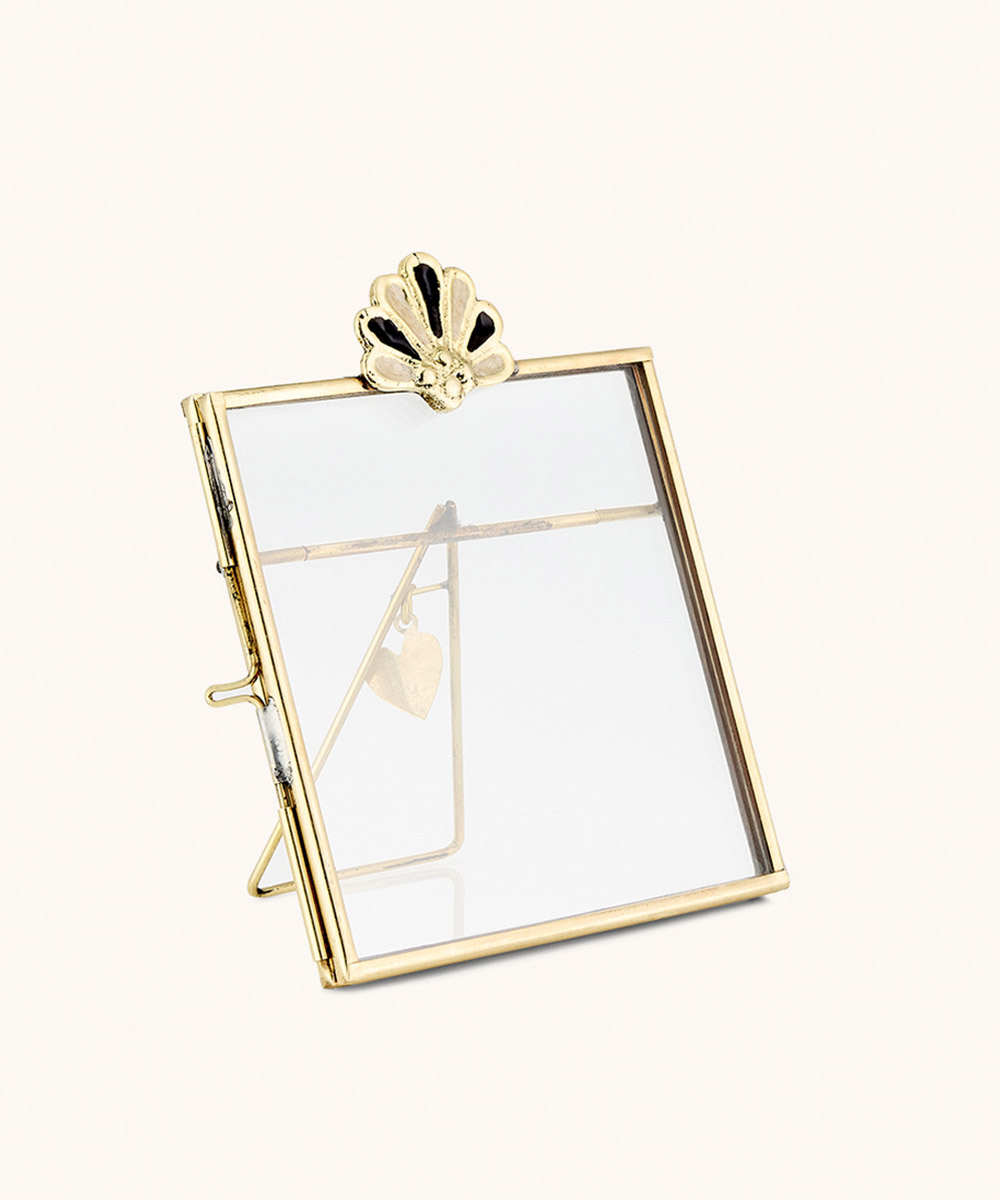 The Rosie Roset Polaroid Photo Frame blends classic design with refined materials. The transparent glass provides a clean and polished display, while the brass frame adds warmth and elegance. The sculpted shell accent at the top gives it a unique flair without overpowering your photo.