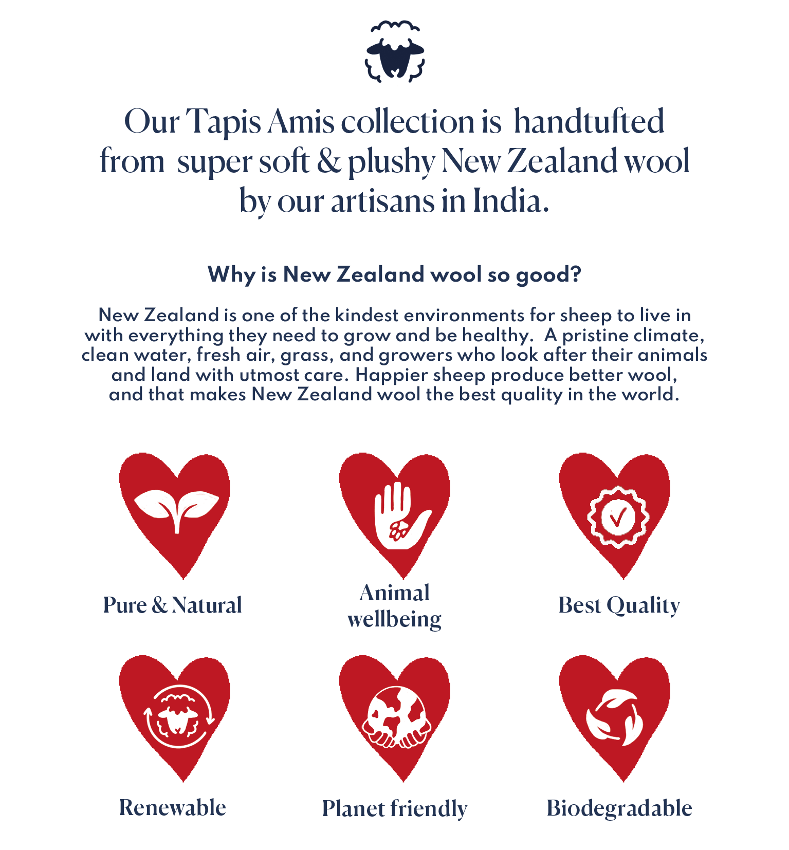New Zealand wool is a fiber loved for its softness, beautiful quality and kindness to animals. It allows us to bring even more richness and durability to our rugs.