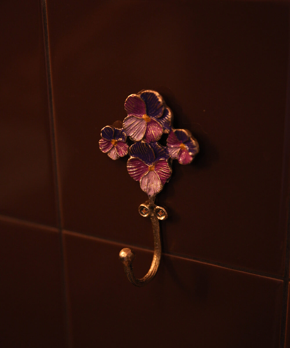 Adorn your walls with the splendor of spring with our Valery Violet Field Hook. This brass hook is a celebration of floral artistry, featuring a cluster of violets hand-painted in delicate shades of purple with yellow accents. It's a functional piece that doubles as an enchanting decorative element, bringing the serenity of a violet field into your home.