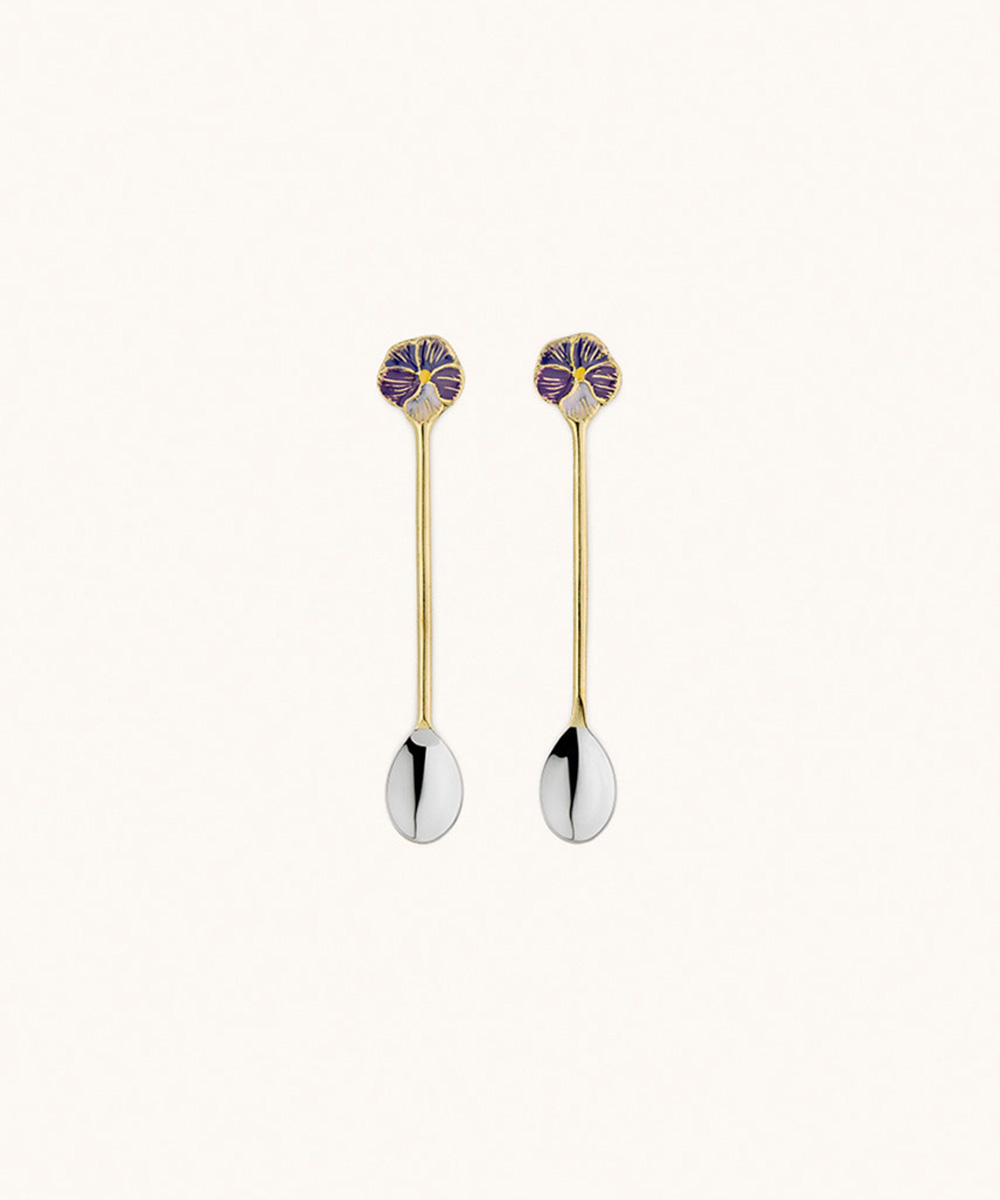 Bring charm and refinement to your table with the Valery Violet Teaspoon Set. These small spoons feature a golden brass handle topped with a violet flower design in hand-painted enamel. The spoon bowl is made of food-safe stainless steel, making the set both decorative and practical.
