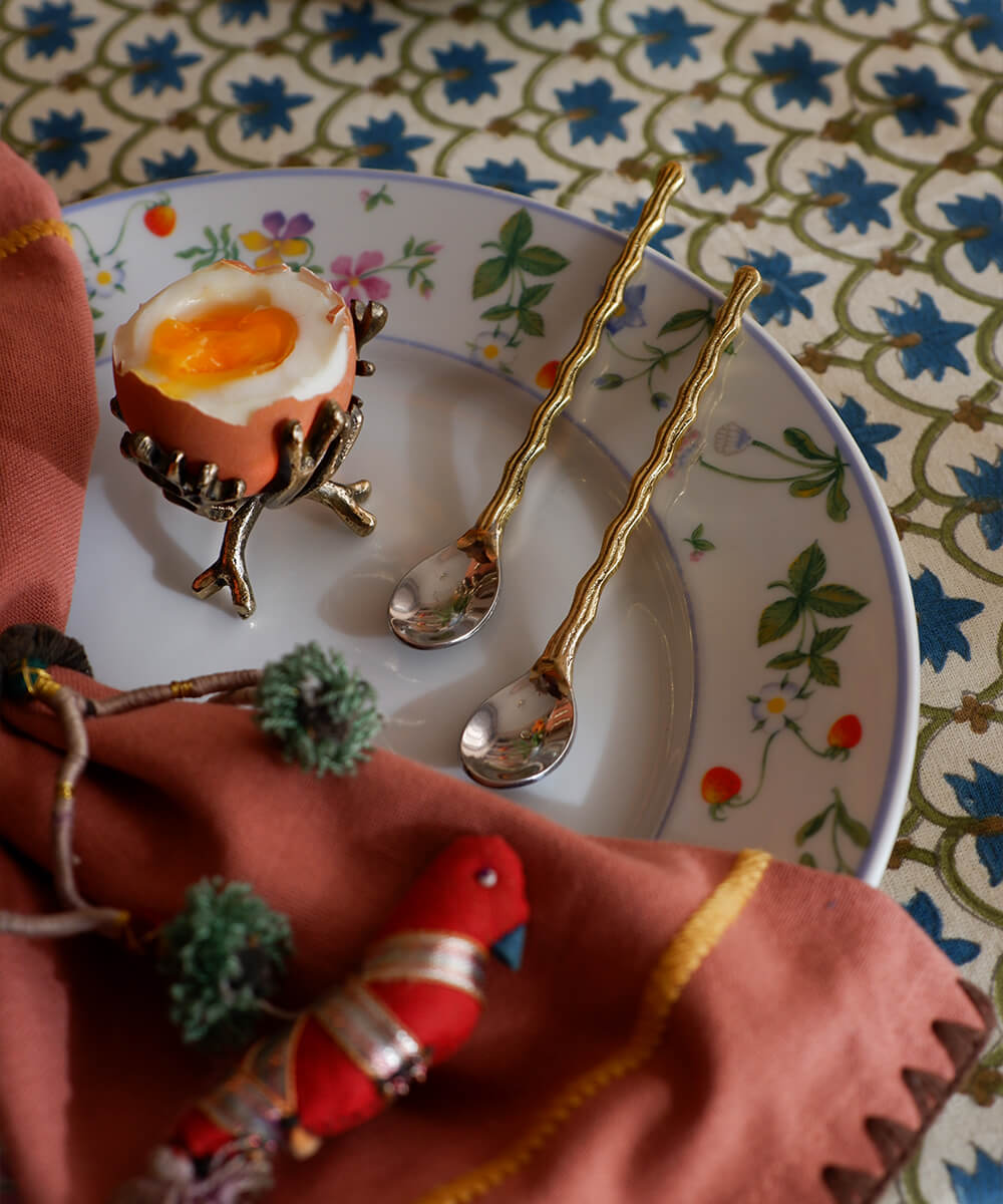 These teaspoons are handmade in India from 100% recycled brass. The spoon part is made of stainless steel. Due to the handcrafted nature of this item, expect slight variation in the appearance of each item. Perfect by no means, but unique all the more!